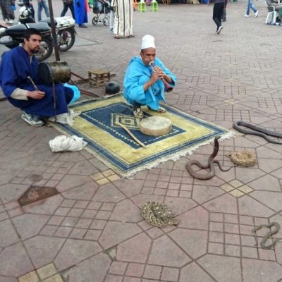 Nach dem Essen steuerten wir das Herz der Medina an; den riesigen Platz Djeema el Fna. Der Name bedeutet wohl in etwa Versammlungsort der Toten und rührt daher, dass die Berber-Dynastie der Almohaden hier im 12. und 13.Jahrhundert Menschen hinrichtete. Heute ist es ein unheimlich belebter Platz, den man erlebt haben muss. Möglicherweise gibt es hier die größte „Hello, my friend“-Dichte von ganz Marokko. Ich kann jeden verstehen, der davon genervt ist, aber ignorieren und weitergehen hilft in 96 % der Fälle. Ansonsten haben wir in Serbisch auf die Nervensägen eingeredet und diese Sprache hat es noch nicht ins Portfolio der marokkanischen Anquatscher-Gilde geschafft. Außerdem wissen die, dass ein slawischer Saša nicht so ein Selbstbedienungsladen wie beispielsweise ein deutscher Heinz ist und verlieren dank ihrer unternehmerischen Effizienz sofort das Interesse. Denn die nächsten potentiellen Kunden stehen förmlich schon Schlange.