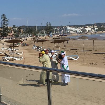 Nach dem Essen setzten wir unseren Spaziergang nochmal fort und erschlossen uns den fehlenden Rest der Medina. Am Ende blieb noch eine halbe Stunde bis zur vereinbarten Abfahrtszeit. Wir beschlossen noch einen Minztee in einer Strandbar zu trinken (ja, Essaouira hat auch einen tollen und ausgedehnten Sandstrand zu bieten). Eine Kanne a. k. a. drei Gläser Tee kostete 1 € und die aufmarschierenden Musiker gaben sich mit einem Dirham Trinkgeld für ihre Darbietung zufrieden.