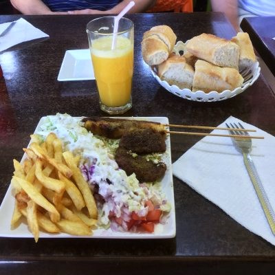 Um den aufgekeimenden Appetit nach einer warmen Mahlzeit zu stillen und unsere Kleidung nicht nur grob vom Möwenkot zu befreien (wenigstens fiel weiße Scheisse auf weißem Untergrund nicht so auf), hielten wir fortan Ausschau nach einer gastronomischen Einkehrmöglichkeit. Allerdings war uns das Preisniveau in der Medina zu hoch (Hauptgerichte knapp 10 €, Vorspeisen circa 4 €, Getränke um die 2 €). Deshalb verließen wir die Altstadt durch das nördliche Tor Bab Doukkala und schlenderten die tourifreie Avenue Al Massira Al Khadra entlang. Am Ende tauchten mehrere Imbisse auf und der höchstfrequentierte bekam den Zuschlag. Pizzeria Adam schien der Name zu sein. Wir gönnten uns frischgepressten Orangensaft und Tajine mit Tomate, Ei und Hackbällchen als ersten Gang. Darauf folgten Shawarma bzw. alternativ kleine Fleischspieße. Außerdem gab es zuvor eine große Schüssel Fritten als „Gruß aus der Fritteuse“ gratis und zum Essen natürlich Brot ohne Ende.