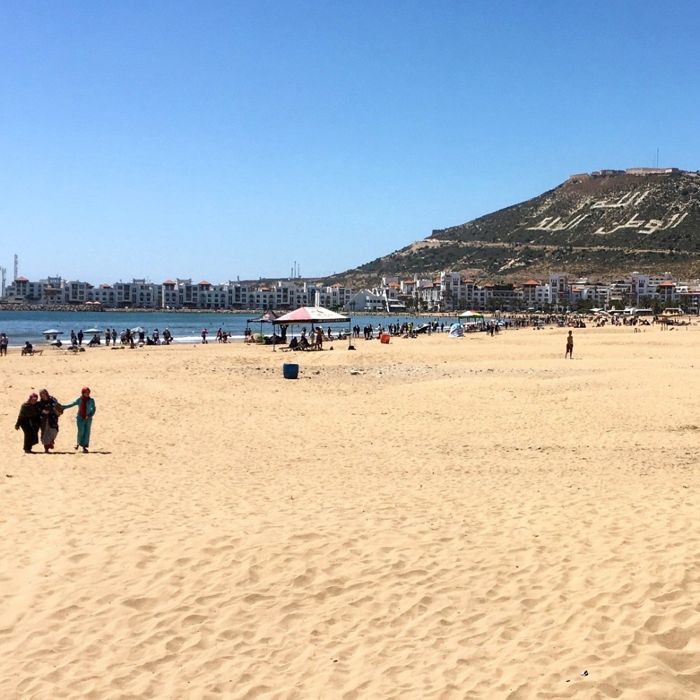 Wer sich hier übrigens sonnen oder in die Fluten des Atlantik stürzen will, wird beim Blick ans Nordende des Strands immer daran erinnert welche Werte in Marokko zählen. Am Hang des Hausberges von Agadir steht es riesig geschrieben: „Allah, el Watan, el Malik“. Gott, das Vaterland und der König thronen über allem. Im Schatten dieser Botschaft dominieren allerdings Vergnügen und Völlerei die nette Strandpromenade. Die großzügigen Sandstrände werden ergänzt von zahlreichen Bars, Restaurants und einem kleinen Vergnügungspark mit Riesenrad. Außerdem gibt es öffentliche Fitnessgeräte für die Ertüchtigung der Strandbesucher.