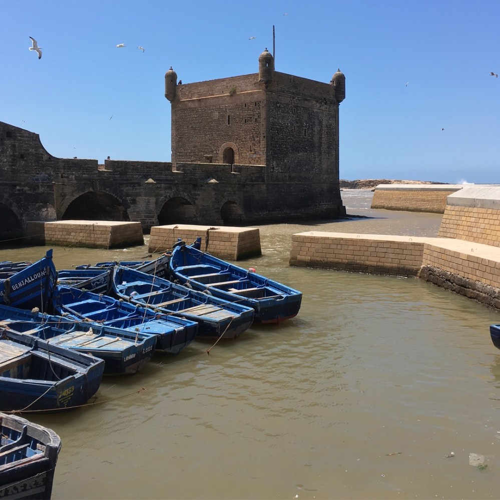 Der Bau von Mogador wurde 1506 unter Dom Manuel I de Portugal abgeschlossen. Die manuelische Architektur (eine portugiesische Sonderform der Spätgotik, benannt nach Dom Manuel I) war bei der Festung klar erkennbar, wenn natürlich bei diesem strategischen Außenposten der funktionale Charakter Vorrang vor dem Repräsentativen hatte. Sprich, so schön wie beim Torre de Belém in Lissabon sah das hier selbstredend nicht aus. Aber es war mit den markanten Ecktürmen, den alten Kanonen und den zahlreichen blauen Fischerbooten, deren Bau bzw. Restauration man hier nebenbei auch beiwohnen konnte, ein toller Touri-Spot.