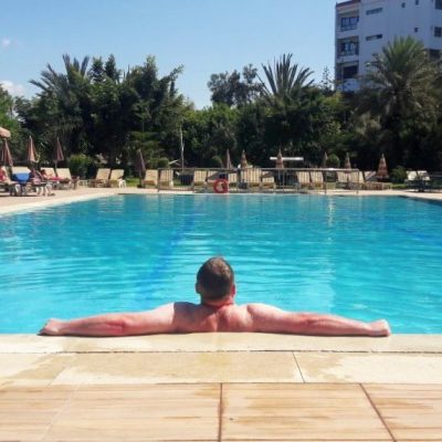 Zielsicher steuerte er das Hotel Tildi (****) an, wo wir landestypisch mit Pfefferminztee begrüßt wurden. Nach dem Check-In inspizierten wir noch kurz der Poolbereich und das Fitnesscenter des Hotels, doch dann ging es erstmal zum Atlantikstrand, welcher keine fünf Gehminuten entfernt war. Bei der Idee sich der T-Shirts zu entledigen, warf ich ein, dass in einem muslimischen Land auch die Männer nicht viel Haut zeigen. Einwand vorerst angenommen, jedoch mit dem Zusatz „Wenn hier doch welche oberkörperfrei rumlaufen, sind die T-Shirts sofort aus“ versehen. Wenig später sahen wir in der Tat ein paar Typen nur in Shorts, doch als ich auf dem zweiten Blick sah, dass es nur 10 bis 12jährige Kinder handelte, war es bereits zu spät. Fortan hatte ich die zwei einzigen oberkörperfreien erwachsenen Menschen auf Agadirs Strandpromenade an meiner Seite.