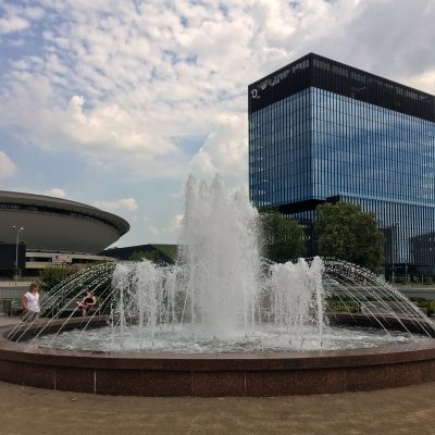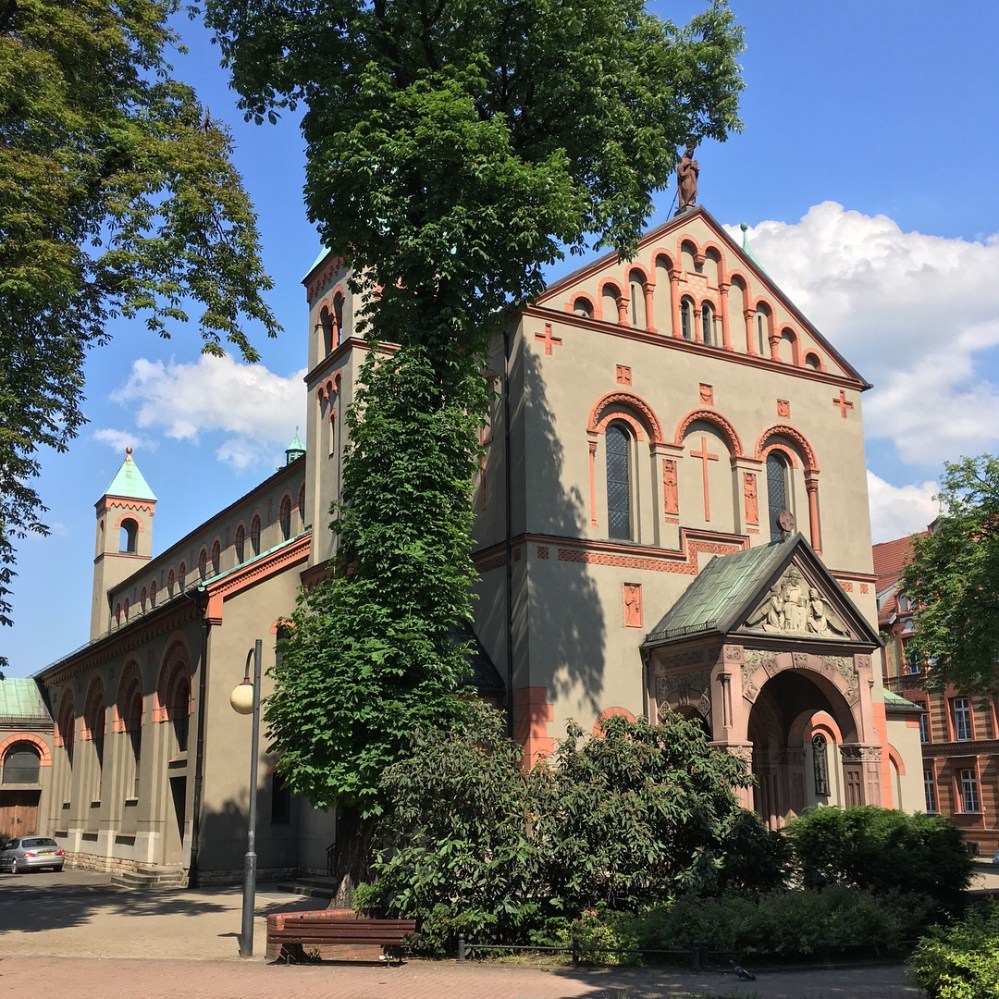 Nachdem wir aus dem Stadion raus waren, machten wir uns auf in die Innenstadt von Chorzów (ehemals Königshütte). Wenig überraschend ließ diese Malocherstadt das Touri-Herz nicht höher schlagen, aber bei sommerlichen Temperaturen und viel grün, war das Stadtbild nicht ganz so deprimierend. Außerdem bröckelte nicht überall der Putz. Die Haupteinkaufsstraße namens Wolności war fein herausgeputzt und die größeren repräsentativeren Gebäude wie die Parafia św. Barbary (Barbarakirche), die Parafia św. Jadwigi Śląskiej (Hedwigskirche) oder das Gmach Poczty (altes Hauptpostgebäude) ebenso.