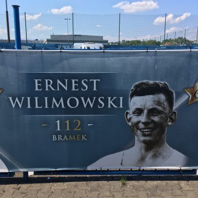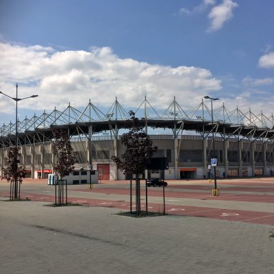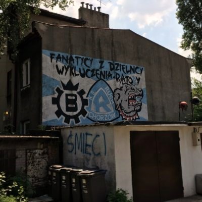 Für Sonntag war natürlich das Derby Ruch Chorzów versus Zagłębie Sosnowiec ohne Konkurrenz in unseren Planungen. Da bereits um 12:45 Uhr angestoßen werden sollte, hieß es um 10 Uhr aufstehen und zeitnah eine Straßenbahn in die Nachbarstadt besteigen. Die Erstbeste mit der Aufschrift Chorzów endete zwar bereits kurz hinter der Stadtgrenze am Stadion Śląski, aber von dort waren es auch nur 20 Fußminuten bis zum Stadion Miejski, wo Ruch seine Heimspiele austrägt. Und ’ne Tankstelle, bei der wir das georgische Wunderwasser Borjomi erwerben konnten, lag glücklicherweise am Wegesrand. Die Bewegung an der frischen Luft und das mineralienreiche Wasser aus der kaukasischen Bergquelle, vertrieben den lästigen Kater aus unseren Körpern.