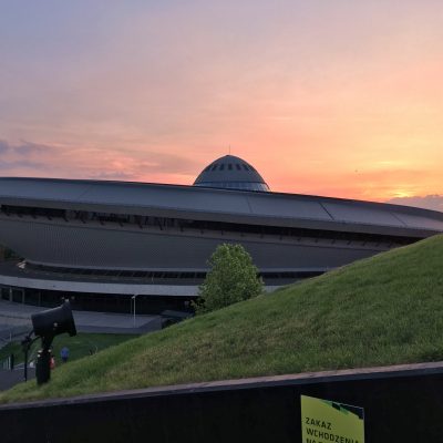 Wir entschieden uns nach dem Essen für Lungern in der Abendsonne am Spodek, der Katowicer Veranstaltungshalle in Form einer fliegenden Untertasse. Auf dem Weg dorthin kam uns ein junger Mann mit blutverschmierten Händen und einem zermatschten Auge entgegen. Na ja, der polnische Kohlenpott ist halt nicht Disneyland. Nichtsdestotrotz erreichten wir einen ganz friedlichen Ort, an dem außer uns nur Liebespaare, Hobbyfotografen und Hundehalter zugegen waren.