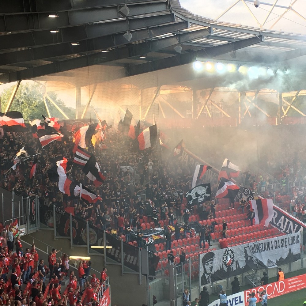 Zur Beginn der 2.Hälfte setzten die Hauptstädter obendrein schöne optische Akzente in ihrer Stadionecke. Bei der Wiederkehr der Teams war eine Blockfahne mit dem Logo der Ultras Enigma ausgebreitet und darunter wurde wenig überraschend ein kleines Feuerwerk vorbereitet. Als der Rauch langsam von dannen zog, packten sie auch noch über ein Dutzend Schwenkfahnen aus. Man merkte, dass das Spiel auch für sie Highlight war, welches eine Atmosphäre der Extraklasse bekommen sollte. Sprich, das ganze Drumherum gehörte in die Ekstraklasa und nicht in die viertklassige III Liga.