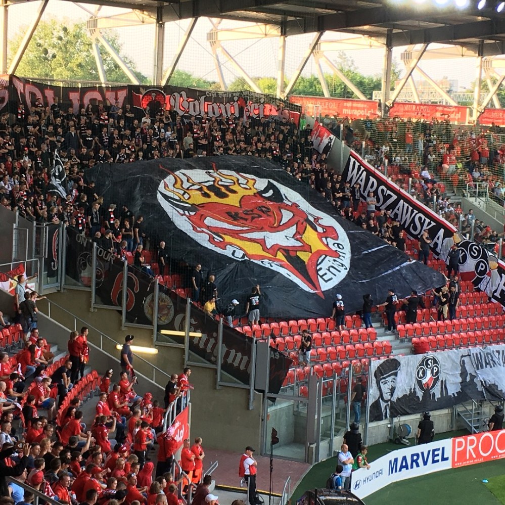 Im Endeffekt versackten wir für über 90 Minuten, statt der geplanten Stunde. Nachdem jeder mit Trinkgeld 100 Złoty los war, ging es deshalb fix mit einem Taxi zum Stadion. Wir waren kurz vor Anpfiff drin und platzierten uns in der Medienebene der Haupttribüne nun ziemlich nah am gut gefüllten Gästeblock. Polonia, fantechnisch die (abgeschlagene) Nr. 2 in Warszawa (Warschau), hatte gut für das Topspiel mobilisiert. So rund 600 Hauptstädter dürften es gewesen sein. Ihr Sektor war schön beflaggt und die Fans trugen alle schwarz.