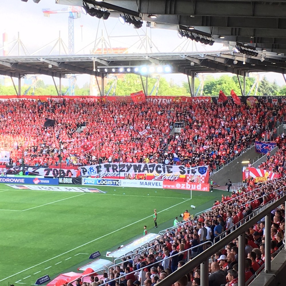 Der Rest des Stadions war dagegen zu 96 % in rot gekleidet. Dazu hatte der etatmäßige Fanblock von Widzew eine große Blockfahne präsentiert. Motto: Alles auf Rot! Optisch schon einmal alles erste Sahne und akustisch sollte es auch eine Galavorstellung werden. Hier gab es auf keiner der Tribünen träges Publikum. Alles wirkte wie ein riesiger Fanblock, bei dem der harte Kern der rechten Hintertortribüne den Takt vorgab.