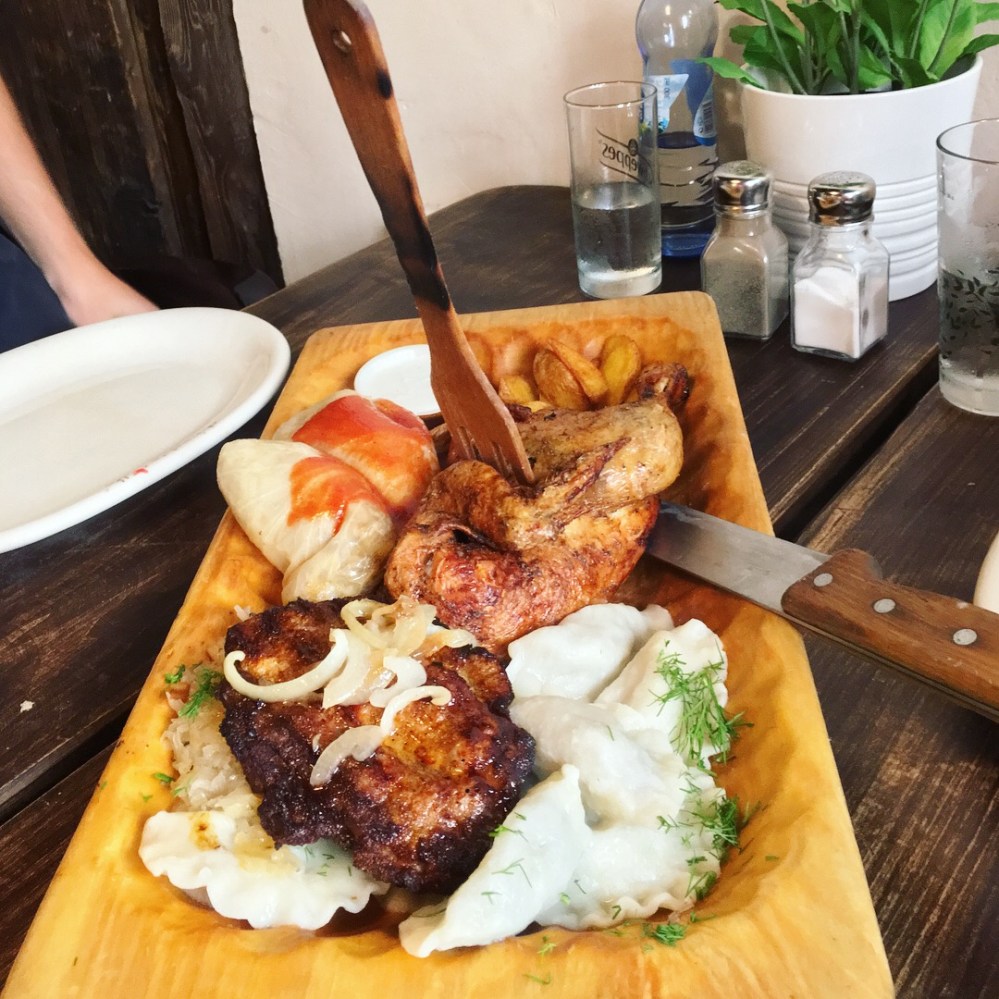 Kurz vor’m Sonnenbrand war Zeit für Mittagessen und es zog uns ins Restaurant Chłopskie Jadło (was wohl soviel wie Landküche oder Bauernessen heißen muss). Der Name hielt was er versprach und es gab deftiges Essen. Gruß aus der Küche war das obligatorische Schmalzbrot und danach ging es weiter mit einer kräftigen Żurek (polnische Sauermehlsuppe mit ordentlich Fleischeinlage, Kartoffeln und gekochtem Ei). Hauptgang wurde bei meinen Freunden ein Holztrog mit Schweinesteaks, diversen Pierogi, Kohlrouladen, Sauerkraut, Kartoffelecken und ’nem halben Hahn.