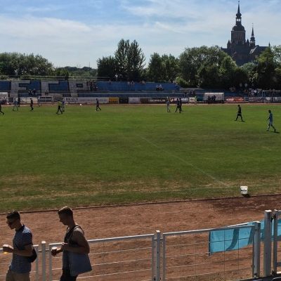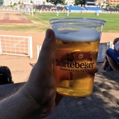 Das Spiel vom bereits geretteten Vierzehnten (FC Pommern) gegen den bereits abgestiegenen Fünfzehnten (Friedland) war natürlich auch keine Augenweide und nach einem frühen Doppelpack von Kevin Kutz für die Hausherren (14. und 16.Minute) kehrte deutliche Langeweile ein. Daher schauten wir uns lieber jeden Winkel des wirklich coolen Stadions an, spotteten Hoppergesindel und bräunten uns letztlich die meiste Zeit auf den Stehtraversen. Dazu gab es diverse Störtebeker vom Faß gegen die Hitze.