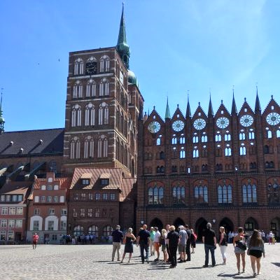 Idealerweise musste man in Stralsund vom Hauptbahnhof zum örtlichen Stadion der Freundschaft einmal die Altstadt durchqueren (UNESCO Welterbe). So sahen wir in den 80 Minuten bis zum Anpfiff nochmal alle Highlights der historischen Hansestadt. Stralsund hatte mich bei einer kurzen Stippvisite vor 53 Wochen bereits überzeugt und war logischerweise seitdem nicht hässlicher geworden. Besonders hervorzuheben unter den ungefähr 1.000 Baudenkmälern der Stadt (davon über 500 in der Altstadt) sind natürlich die Großkirchen, das Rathaus und der Marktplatz.
