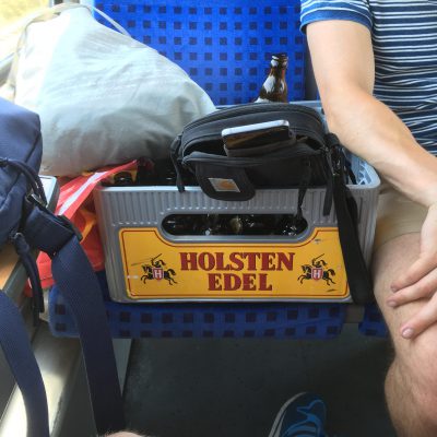 Am ehemaligen Lehrter Bahnhof, heute Hauptbahnhof, bestiegen wir nun den RegionalExpress nach Stralsund, der uns binnen 3,5 Stunden und ohne weitere Umstiege ans Ziel brachte. Dabei wurden wir auch Flasche um Flasche unser sperrigstes Gepäck los: Die in Uelzen – am südlichen Ende des Vertriebsgebiets dieser Bierspezialität – erstandene Kiste Holsten Edel.