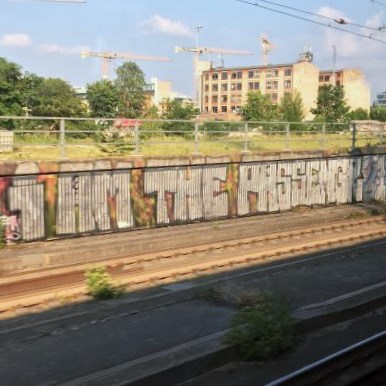 Dann rollte um 8:38 Uhr der RegionalExpress nach Berlin ein und wir fuhren wieder gute drei Stunden durch Pommern und Brandenburg, ehe die Hauptstadt der Republik erreicht war. Neben der Natur und schönen Stadtsilhouetten wie von z. B. Anklam, galt der Blick aus dem Fenster natürlich auch immer den Graffiti am Streckenrand. Lange Zeit fuhren wir grafisch noch durch Hansaland, während die Hauptstadt an den Schienenwegen natürlich komplett zugehackt war und die Fußballgraffiti von Hertha, Union & Co in der Masse etwas untergingen.