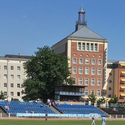 Alsbald lachte auch die Sonne wieder und die Talente durften uns 80 Minuten vorspielen. Talent und Spielfreude hatten beide Nachwuchsteams zu bieten, nur klappte es mit dem Toreschießen heute nicht und so trennten sich der Dritte und der Vierte der Regionalliga Nordost (zweithöchste Spielklasse) nur 0:0. Der Star war damit heute das Stadion (von 1930) mit seiner markanten Haupttribüne. Als Historiker fragt man sich natürlich warum das Stadion ausgerechnet den Namen eines Historikers trägt. Die Recherche ergab, dass die Räume im Bauch der Haupttribüne in den 1930er Jahren an das Theodor-Mommsen-Gymnasium als Unterrichtsräume untervermietet waren. Dadurch bürgerte sich der Name Mommsenstadion ein.