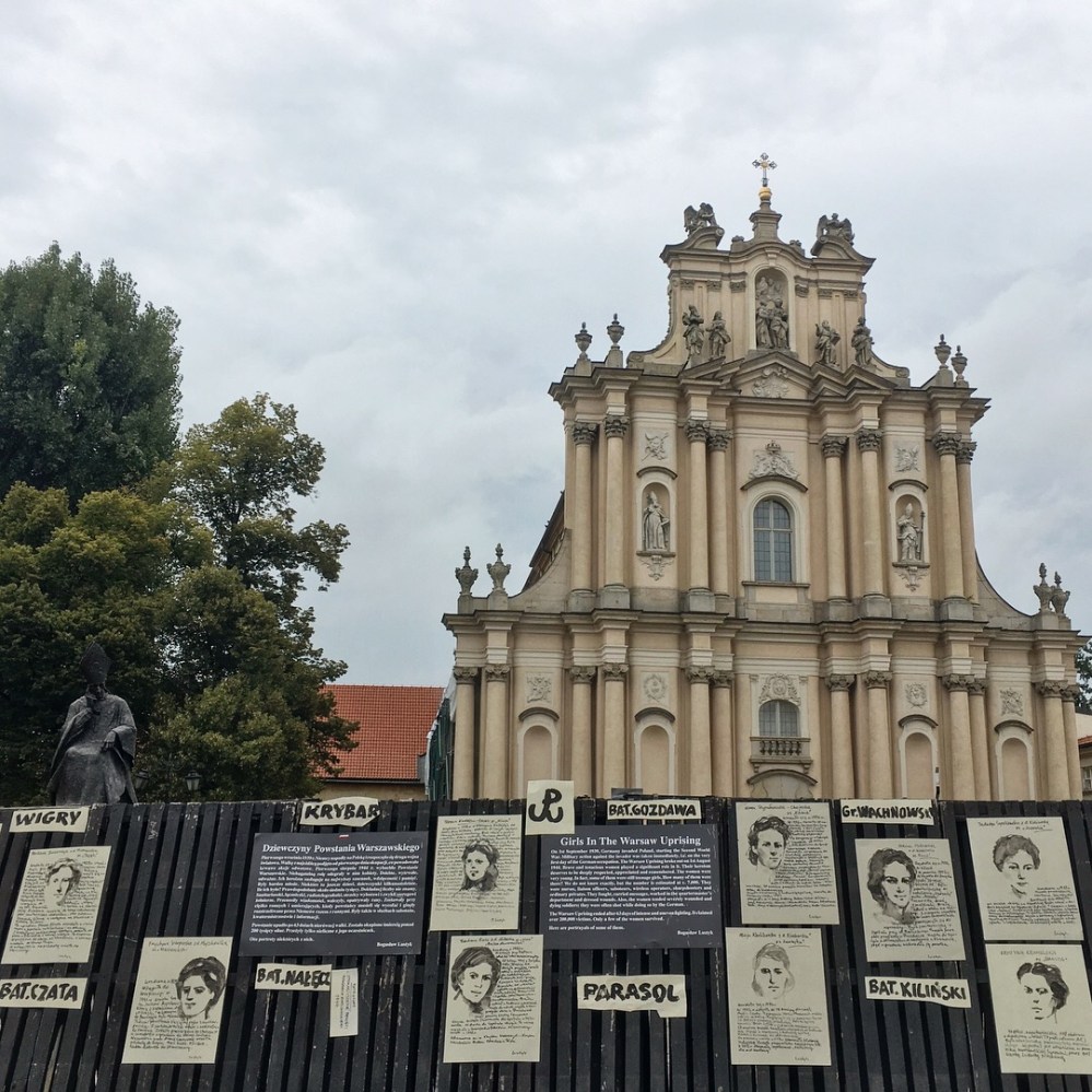 Es folgen nordwärts das Hauptgebäude der Universität, der Pałac Prezydencki (Präsidentenpalast) und zahlreiche andere Paläste und Kirchen. Vor der barocken Kościół Wizytek (Visitantinnen-Kirche) fand ich ein Mahnmal für die im Jahre 1944 am Powstanie warszawskie (Warschauer Aufstand) beteiligten Frauen und wenige Meter weiter eine Ausstellung mit Fotoportraits von damaligen Freiwilligen in der Galeria Kordegarda.