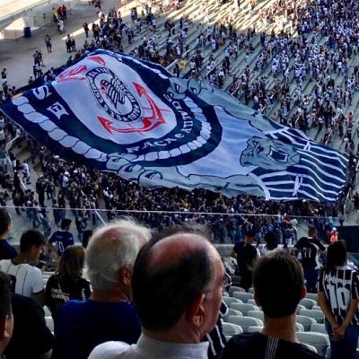 Die rund 1.000 Gästefans aus dem 1.150 km entfernten Porto Alegre waren aus dem Häuschen und mit 0:1 ging es in die Halbzeitpause. Zeit für eine Stilkritik der Fans! Bei den Corinthians dachten wir erst, dass die heute richtig Power machen. Gut gefüllter Block und zu Beginn wurde eine große Blockfahne entrollt. Ebenfalls war die Beflaggung des Blocks und die konsequente Bekleidung in Vereinsfarben (war gestern beim SPFC auch so) sehr ansprechend. Die Mitmachquote im Block gefiel auch, nur blöderweise gab es vier Stimmungskerne und jeder kochte sein eigenes Süppchen. Da schreien die einen gerade das Team mit viel Gestik nach vorn, während die anderen Samba tanzen und die nächsten gerade mit dem Rücken zum Spielfeld hüpfen. Nicht so meins…