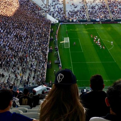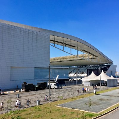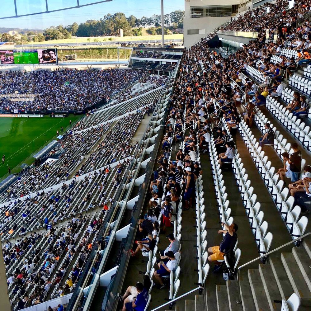 Nach einem kurzen Rundgang organisierten wir zwei Taxis und ließen uns zur rund 25 km vom Zentrum entfernten Arena der Corinthians kutschieren (ich glaube je Taxi waren das ungefähr 100 Reais, also 20 €). Dort wurden während der WM 2014 sechs Spiele ausgetragen (u. a. das Eröffnungsspiel Brasilien – Kroatien und das Halbfinale Niederlande – Argentinien) und nach dem Turnier übernahm der zweitbeliebteste Fußballclub des Landes (nach Flamengo) die Rolle des Hauptnutzers dieser modernen Sportstätte. Dafür wurde die Kapazität allerdings von 62.601 auf 48.000 Plätze reduziert. Da heute, geschätzt über 30 Millionen Corinthians-Fans hin oder her, auch nur knapp 30.000 zahlende Zuschauer die Drehkreuze passierten, sicher eine vernünftige Entscheidung (gemessen an der Kaufkraft der meisten Fans, sind die Eintrittskarten nicht so günstig).