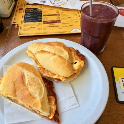 Eigentlich wollten wir zur Aussichtsterrasse des Copan hinauf, doch leider war diese wegen Renovierungsarbeiten geschlossen. Daher kehrten wir zunächst in ein Café im Erdgeschoss des Komplexes ein. In der Padaria Santa Efigênia gab es nicht nur Backwaren, sondern auch viele warme Gerichte. Wir gönnten uns Acai Smoothies (seit Rio mein neues Lieblingsgetränk) und Calabrese Sandwiches (diese Baguettes kamen mit Omelette und einem würzigen Steak daher). Dabei wurde recherchiert, von wo man noch den Ausblick über die Stadt genießen könnte. Edifício Banespa: heute geschlossen, Edifício Italia: macht erst um 15 Uhr auf, Edifício Matarazzo: nur werktags geöffnet…