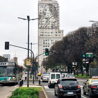 Als es weiter ging, bewunderten wir noch die Kreuzung dieser Avenida mit der vierzehnspurigen Avenida 9 de Julio (die wichtigste Nord-Süd-Verbindungsstraße in Buenos Aires, welche namentlich an die Unabhängigkeit des Landes am 9.Juli 1816 erinnert). Links sahen wir nun mit dem Obelisco de Buenos Aires ein weiteres Wahrzeichen der Stadt und rechts war das Hochhaus des Gesundheitsministeriums zu sehen, dessen Fassade 2011 auf Veranlassung der damaligen Präsidentin Christina Fernández de Kirchner mit einem Porträt von Evita verschönert wurde. An Eva Evita Perón, der zweiten Gattin des einstigen Präsidenten Juan Perón, kommt man in Buenos Aires bzw. ganz Argentinien nur schwer vorbei. Ob Hure oder Heilige, ob Faschistin oder Feministin, wird von mir an dieser Stelle nicht geklärt werden können. Die Biografien der Peróns und das Wirken des Peronismus bis ins zeitgenössische Argentinien finde ich zwar hochinteressant, sprengen hier jedoch leider den Rahmen.