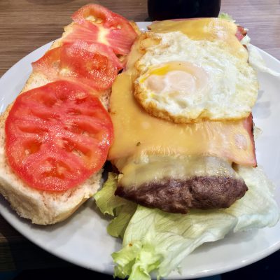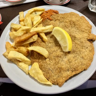 Nachdem wir alle Fanshops und Sportgeschäfte der Gegend abgeklappert hatten, ließen wir uns für ein Mittagessen im Café Florida nieder. Ich dachte erst an Touri-Nepp, aber 170 Pesos für ein Kalbsschnitzel mit Fritten waren doch recht preiswert (so ungefähr 3,33 €). Dafür waren die Getränke und das Cubierto etwas teurer als anderswo. Das Cubierto ist eine Servicegebühr für das Besteck und Geschirr, umfasst aber auch noch Brot, Butter usw., was vor dem Essen gereicht wird. Alles in allem wurde trotzdem jeder, inklusive Trinkgeld (das ist nicht im Cubierto enthalten), mit nur umgerechnet sechs bis sieben Euro belastet. Dass in Argentinien nur eine Gesamtrechnung pro Tisch üblich ist und man sich selbst einen Gefallen tut, wenn man nicht wie ein Groundhopper alles exakt aufdröselt, erwähne ich an dieser Stelle auch gleich nochmal. Am besten man teilt den Gesamtbetrag durch die Personen oder wechselt sich mit dem Bezahlen in den Restaurants ab. In beiden Fällen gilt: Mal gewinnst du, mal verlierst du, aber unter’m Strich gleicht sich unter guten Freunden natürlich eh alles aus.