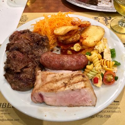 Ein erster Erkundungsgang durch Buenos Aires führte uns dann am Abend ins Viertel San Telmo, wo wir willkürlich in die erstbeste Parrilla (so heißen hier die Grillrestaurants) einkehrten. Bei Javi’s Parrilla gab es zwei Grillplatten für je 850 Pesos. Rumpsteak, Roastbeef, Rippchen und T-Bones waren darauf angerichtet und eine Platte sollte laut Bedienung für drei Personen reichen. Na ja, für Durchschnittstouristen wohl schon, wir dagegen hätten durchaus noch eine dritte Platte vertragen. Geschmacklich war es allerdings top und am Ende mussten wir für zwei Grillplatten plus Beilagen, 2,0 l Weißwein und 4,0 l Bier nur insgesamt 3.000 Pesos (inklusive 13,12 % Trinkgeld) zahlen. Also rund 11 € pro Person.