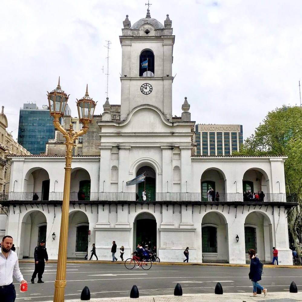 Vom Plaza del Congresso führte uns nun die schnurgerade als Prachtstraße Avenida de Mayo zum Plaza de Mayo. Überhaupt sind in Buenos Aires fast alle Straßen symmetrisch als Raster angeordnet. Das macht die Orientierung relativ einfach. Bereits im 16.Jahrhundert wurde bei der Stadtgründung ein rechteckiger Grundriss mit 15 Blöcken von Norden nach Süden und 9 Blöcken von Osten nach Westen etabliert. Das beruhte auf den Leyes de Indias. Einer vom spanischen König Felipe II 1573 unterzeichneten Gesetzessammlung für die Stadtgründungen in der Neuen Welt, wobei sich städtebaulich u. a. an Vitruvs Zehn Büchern der Architektur orientiert wurde (ich weiß, absolutes Nerdwissen, aber vielleicht hilft es einem Leser irgendwann mal 1 Mio € bei Günther Jauch zu gewinnen). Dementsprechend findet man von San Francisco bis Feuerland ähnliche Straßenraster bei den spanischen Stadtgründungen.