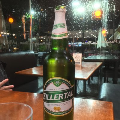 Bei patagonischen Bieren à 3 € für den Halben (war halt so genanntes Craftbeer) recherchierten wir nun die Essensmöglichkeiten im Umkreis. Denn der Hunger war groß geworden und Steaks sollen die Urus angeblich gut können! Blöd nur, dass fast alle Steakhäuser sonntags Ruhetag hatten. Immerhin das Danubio Azul sollte um 20 Uhr öffnen, so dass wir bei mittlerweile strömendem Regen um 19:55 Uhr die 500 Meter dorthin liefen. Doch alles außer der Küchenbereich war noch abgedunkelt. Ein Kellner kam zur Tür und teilte mit, dass erst um 21 Uhr geöffnet wird.