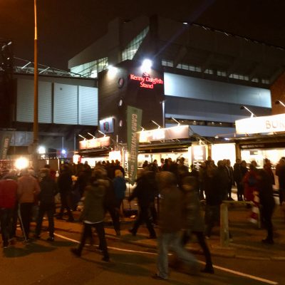 Als wir aus dem Flugzeug heraus waren, sind wir gerannt wie Ben Johnson anno ’88 und waren tatsächlich trotz Passkontrolle schon 15 Minuten später in der Obhut unseres Chauffeurs. Erste Route zeigte 1:20h an, zweite Route 0:55h. Und da fragt der tatsächlich, welche wir nehmen wollen, weil die zweite Variante würde ein paar £ Maut kosten. Also den Bengel schnell noch über unseren Termin aufgeklärt und er gab Gummi. Zum Glück war selbst in Stadionnähe der Verkehr noch fließend (wir rechneten fest damit, dass wir die letzten 1.000 Meter nochmal sprinten müssen), so dass der Fahrer uns 19:34 Uhr am Sir Kenny Dalglish Stand absetzen konnte.