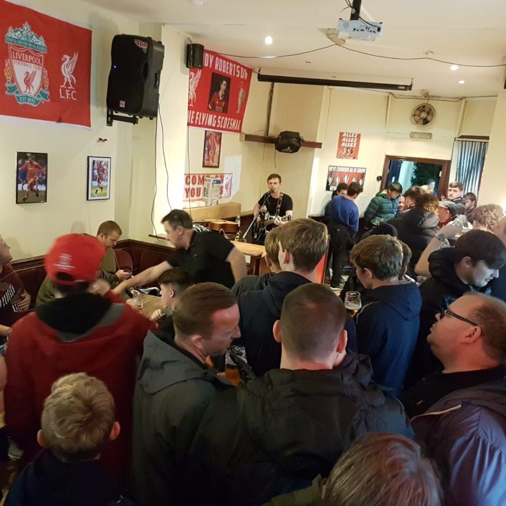 Mit Tommy und seinem Stiefsohn ging es nun in den Pub The New Halfway House. Dort gab es leckeres Tetley’s vom Fass zu einem guten Kurs (2,30 £) und Live Music. Jamie Webster trat mit seiner Gitarre im Pub auf. Der Mann ist mittlerweile eine lokale Berühmheit. Er ist ein Liverpooler Singer-Songwriter, der Songs aus dem Fanblock spielt oder selbst Fanversionen von Musikklassikern dichtet. Seine Performances haben auf YouTube bereits siebenstellige Klickzahlen erreicht und heute erfreute er einen proppevollen Pub mit einem Gratis-Konzert.
