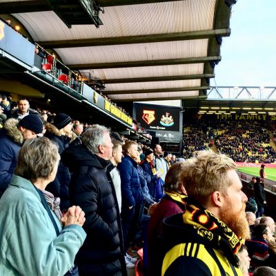 Dem wurde man jedoch zunächst nicht gerecht. Die Geordies, bei denen Ex-96er Joselu nur auf der Bank saß, kamen besser ins Spiel und gingen schließlich in der 29.Minute mit 0:1 in Führung (durch Rondón per Kopf). Gute Laune beim Gästeanhang, der allerdings zuvor im Pub sangesfreudiger als im Stadion war. Da auch Watfords kleine Singing Area keine Bäume ausriss, wurde es mal wieder einer meiner stimmungsärmeren Spielbesuche auf der Insel (zuletzt wurde ich bei Spielen wie QPR vs. Brentford oder Tottenham vs. Arsenal doch verhältnismäßig verwöhnt). Bester Song auf der Heimseite war heute das „Since I was young, I followed them. Watford FC, the team for me…“ Höhepunkt bzw. Kuriosum des Newcastle-Anhangs: Nach 34 Minuten sang der Mob der Geordies geschlossen „Last Christmas“ von Wham. Das war natürlich mies kopiert von Mainz 05. Aber wer auf der Insel kopiert nicht von Mainz 05? (Vgl. „You’ll Never Walk Alone“, welches Anhänger des Liverpool FC der Legende nach von einer Rheinhessen-Hoppingtour an die Mersey mitbrachten)