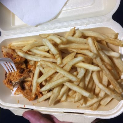 Entgegen der Tradition, wählte ich mal nicht das Dauerangebot Fritten und Kebabfleisch für 3 £, sondern vier kleine Hähnchensteaks mit Fritten für 4.45 £. Blöd, dass ich schon auf dem Zimmer war, als ich merkte, dass ich vergessen hatte den Fraß mit Salz und Saucen genießbarer zu machen. War ’ne trockene Angelegenheit, ganz im Gegensatz zum bisherigen Abend.