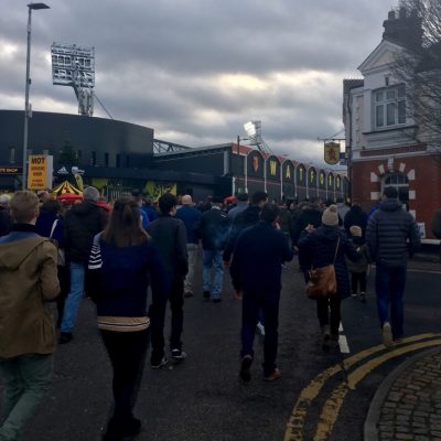 Kurz nach 12 Uhr wurde der Bahnhof Watford Junction erreicht und von dort spazierten wir in das kleine und unspektakuläre Zentrum der 80.000-Einwohner-Stadt. Sehenswürdigkeiten, so genannte Listed Buildings, gibt es in Watford gerade mal eine Handvoll. Ergo fiel das Thema Sightseeing knapp aus und mit dem Watford Palace Theatre (Theater aus der Edwardischen Epoche, 1908 eröffnet), der St Mary’s Church (frühgotische Kirche aus dem 12.Jahrhundert) und der Holy Rood Church (neogotische Kirche aus dem 20.Jahrhundert) liegen drei davon auf dem Weg vom Bahnhof zum Stadion.