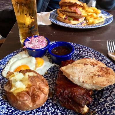 Meine Mitstreiter aßen Burger und ich gönnte mir eine Combo aus Rippchen und Hähnchenbrust mit zwei Spiegeleiern und einer Ofenkartoffel (anstatt fettigen Fritten). Wer jetzt einen Ansatz von fettärmerer und proteinreicherer Kost bei mir ausmachen will: Träumt weiter! Selbstverständlich werden auch 2019 keine Kalorien gezählt. Zumindest im Urlaub nicht (daheim natürlich nur Reis und Thunfisch, ich schwör‘!).