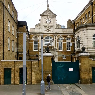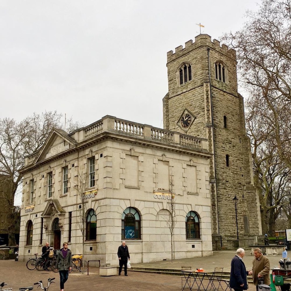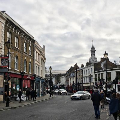 In diesem Barrio machten wir zunächst einen kleinen Einkaufsbummel. Da wir direkt vor einem TK Maxx rausgeworfen wurden, wagten wir dort zuerst einen Blick hinein. Doch in meinen Augen gab es nur Mist. Nach dem erwartbar unergiebigen Abstecher in die vermeintliche Schnäppchenwelt, begutachteten wir den nahen und weithin sichtbaren St Augustine’s Tower. Der Turm ist Überbleibsel einer mittelalterlichen Kirche und zugleich das Wahrzeichen Hackneys, so dass er auch das Wappen des Stadtbezirks krönt.