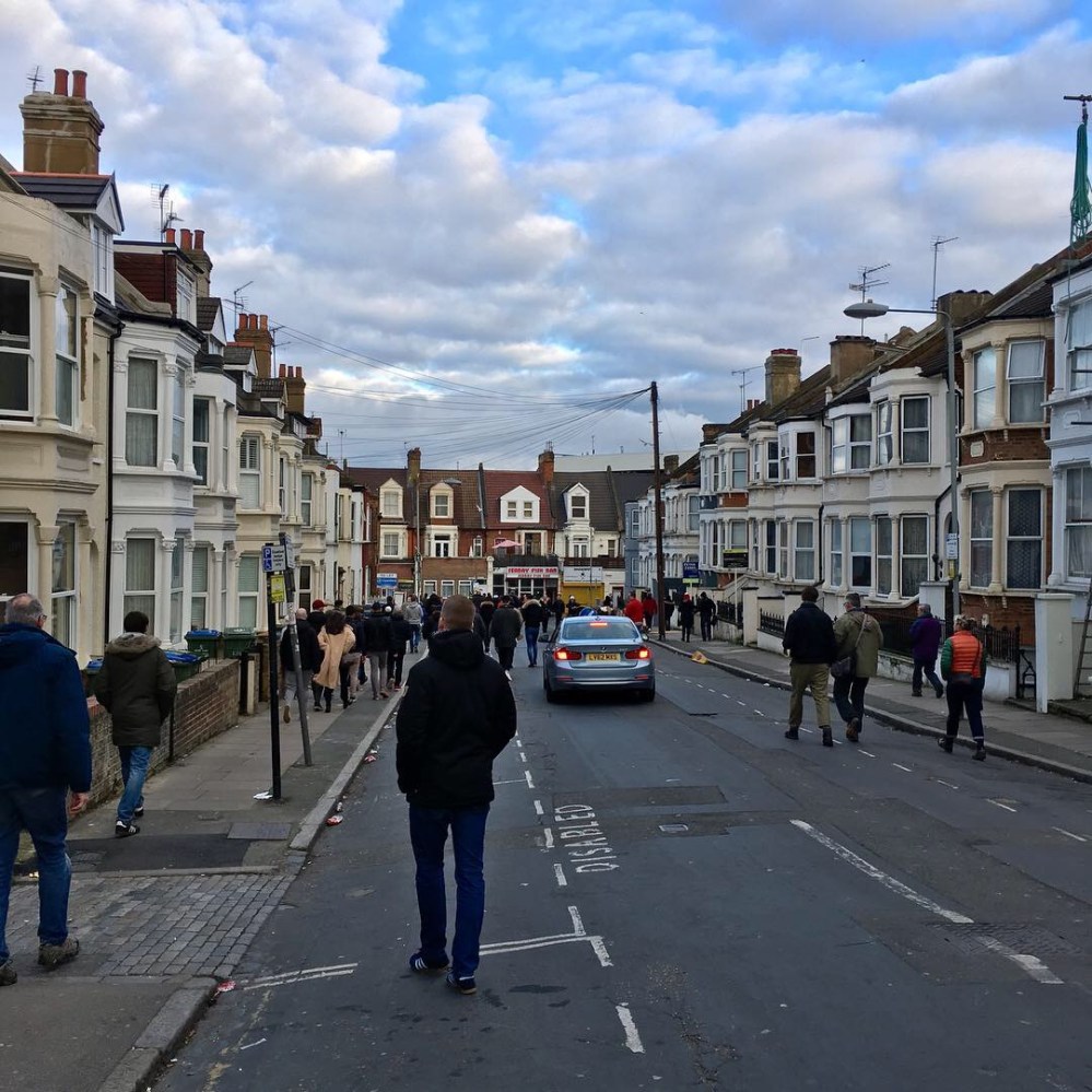 Nicht nur gesegnet, sondern auch gesättigt, ging es anschliessend zum Ground an der Hayes Lane. Das Stadion liegt übrigens in einer gehobeneren Wohngegend. Den Häusern, sowie den Fahrzeugen in den Einfahrten nach zu urteilen, war das wohl schon Mittelschicht auf dem Niveau von Friedrich Merz. Wer weiß, wie viele der Anwohner ein Privatflugzeug auf dem nahen Biggin Hill Airport stehen haben…