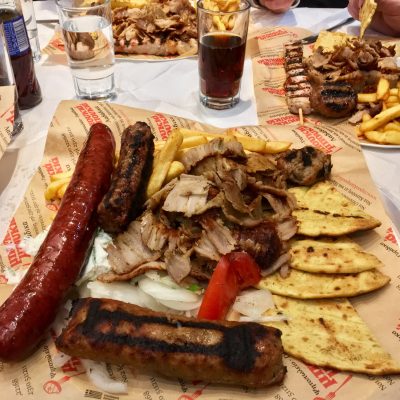 Strategisch klug gebucht, befand sich unser Hotel schräg gegenüber vom Bahnhof. Schnell noch in jenes Hotel Rex eingecheckt und wenig später befanden wir uns auch schon in einem Restaurant im kleinen Kopfsteinpflasterviertel Ladadika, unweit des Fähranlegers. Im Mpoukia Mpoukia wurde erstmal Gyros mit weiteren fleischigen Begleitern serviert. Frühstück und Mittagessen in einem Rutsch, da kann man schon mal in größerem Stil futtern. Deshalb wurde das süße Dessert auf Kosten des Hauses, welches zusammen mit der Rechnung an den Tisch kam, auch nicht verschmäht.