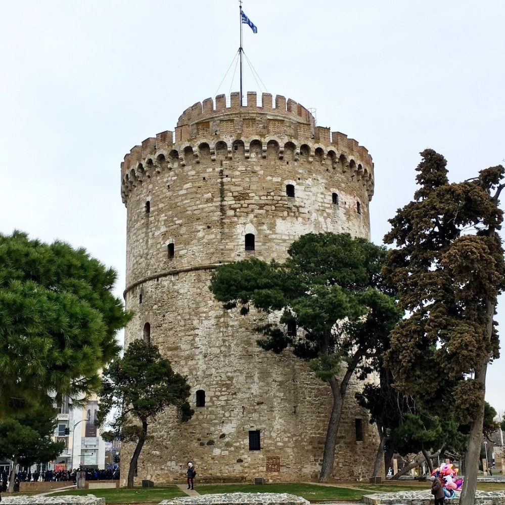 Der Weiße Turm ist der imposante Rest der einst mächtigen Seemauer der Stadt. Der Turm wurde wahrscheinlich im 15.Jahrhundert nach der türkischen (osmanischen) Eroberung errichtet und ersetzte einen byzantinischen Vorgängerbau. Der zylindrische Bau ist 31 Meter hoch und am Boden hat er einen Durchmesser von 23 Metern. Weil die Griechen ihn nach der Rückeroberung Thessalonikis anno 1912 weiß gekalkt haben, bekam er seinen heutigen Namen. Davor war er als Turm als Blutes bekannt, da ihn die Osmanen lange Zeit als Foltergefängnis genutzt haben.