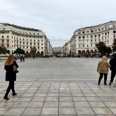 Mit Café frappé zum Munterwerden und Konterbieren aus dem Hause Vergina, verging die restliche Fahrzeit nach Makedonien – nicht zu verwechseln mit Mazedonien bzw. neuerdings Nord-Mazedonien! (für mich wird es allerdings immer FYROM bleiben…) – in Windeseile und das wolkige Thessaloniki wurde mit heiterem Gemüt gegen 13 Uhr erreicht. Erfreulicherweise war der Schnee der letzten Tage schon wieder fast komplett weggetaut.