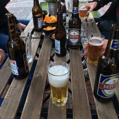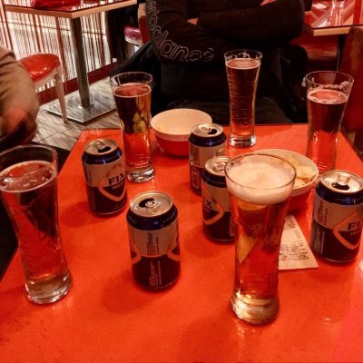 Nach der zweiten Mahlzeit des Tages ging es kurz ins Apartment. Dort wurden, im doppelten Wortsinn, kurz die Akkus aufgeladen. Als Körper und Smartphones wieder bereit für die Öffentlichkeit waren, ging es abermals nach Piräus bzw. ins Viertel Agios Ioannis Rentis. Dort warteten bereits die Inselurlauber El Abto und Olbert bei einem kühlen Bier auf uns. In die nächste Rutsche Bier stiegen wir noch ein, aber dann mussten wir langsam zur Melina-Merkouri-Halle aufbrechen.