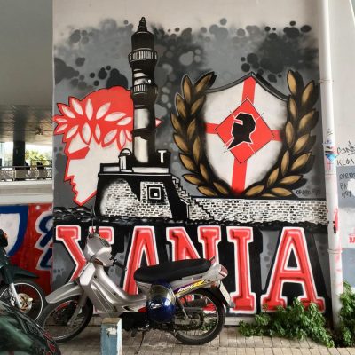 Nach dem Essen hatten wir noch zweieinhalb Stunden bis zum Anpfiff des heutigen Fußballspiels in Piräus. Da lohnte es sich nicht, noch irgend einen Tourikram anzugehen, sondern wir nahmen die nächstbeste Metro in Athens Hafenvorstadt. Dort wiederum machten wir eine Graffititour im Stadionumfeld und ließen uns dann in einer von Gate 7 frequentierten Pinte nieder. Wenn man keinen Bezug zu Olympiakos (oder dem FK Crvena zvezda) hat, würde ich das jedoch keinem normalen Stadiontouristen empfehlen. Angelungert werden ist für tapsige Groundhopper aus unseren Breitengraden vorprogrammiert.