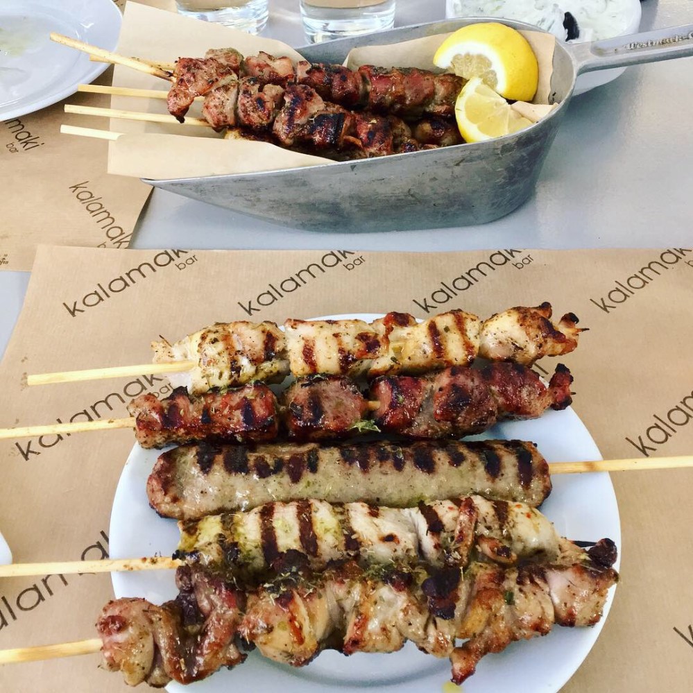 Kneipe war natürlich trotzdem nicht in meinem Tagesplan vorgesehen, aber gegen 12 Uhr trieb uns der Hunger in ein Restaurant in der Nähe von Akropolis und Olympieion. Im Kalamaki gab es Spieße vom Rind, Schwein, Lamm, Kalb und Huhn. Da wir uns so schwer entscheiden konnten, bestellten wir jeder „Einmal alles, bitte“ und vorweg noch einen Pott Zaziki zum Teilen und Dippen (Pitabrot war natürlich obligatorisch).