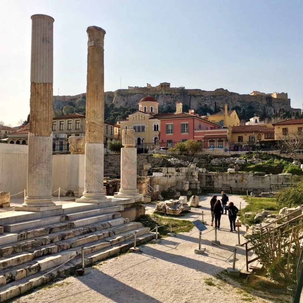 Zurück am Fuße der Akropolis, war es 11:33 Uhr und wir schauten nochmal am Hadrianstor und dem Olympieion vorbei. Das Olympieion war dereinst der größte Tempel Athens und seine Ruinen liegen wenige hundert Meter östlich von der Akropolis. Begonnen wurde der Bau, der vermutlich ein Zeustempel werden sollte, bereits im 6.Jahrhundert vor Christus. Jedoch wurde der Bau irgendwann nicht mehr weiter verfolgt und Themistokles, ruhmreicher Sieger über die Perser in der Schlacht von Salamis 480 v. Chr., nutzte das Baumaterial für seine Schutzmauer um Athen.