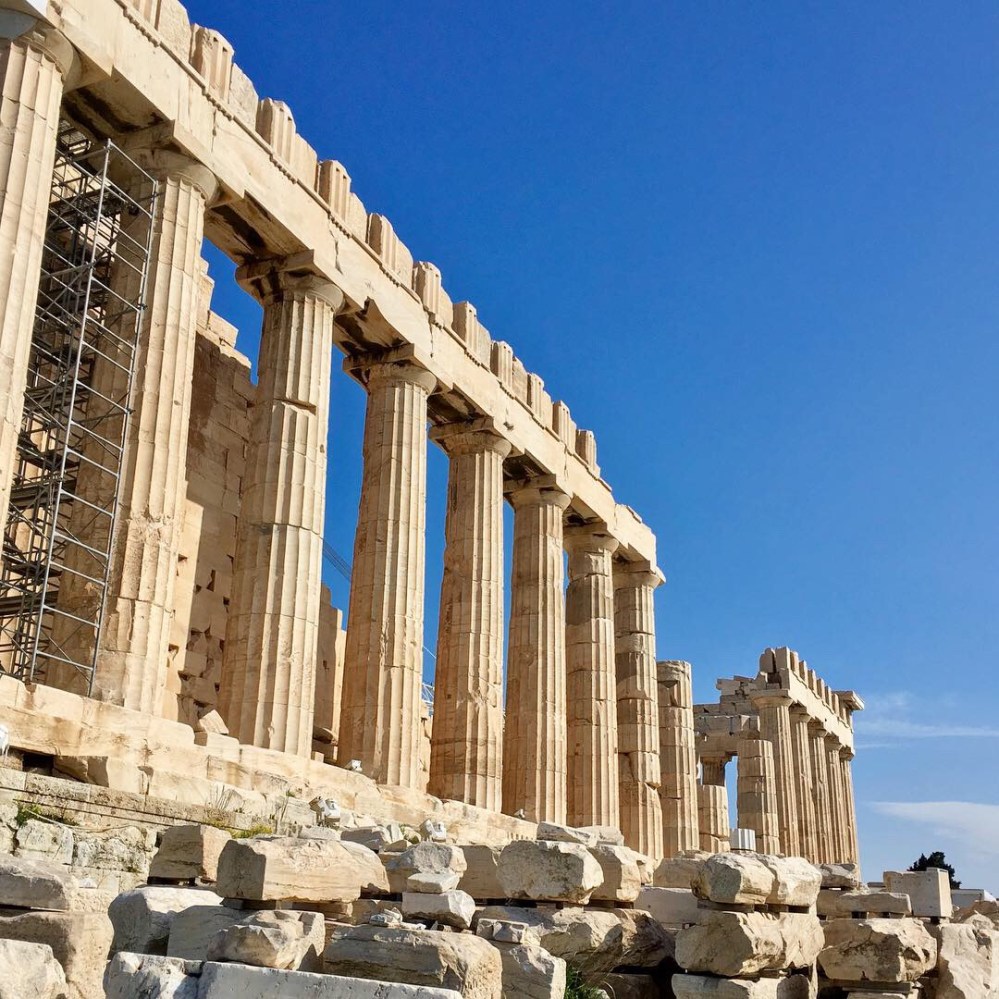 Im zweiten Perserkrieg hatten die Invasoren unter Großkönig Xerxes das bereits evakuierte Athen besetzt und in Schutt und Asche gelegt. Doch nach den Siegen von Athen und seinen Verbündeten (dem Hellenenbund) über die Perser in den Jahren 480 und 479 v. Chr. (Schlachten von Salamis, Plataiai und Mykale), war die persische Gefahr gebannt und Athen wurde wieder aufgebaut. 438 v. Chr. war der neue Parthenon fertiggestellt, dessen Ruinen wir nun inspizieren durften. Übrigens hat auch dieser Tempel seinen deutschen Nachbau, nämlich die Walhalla (von 1842) bei Regensburg.