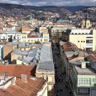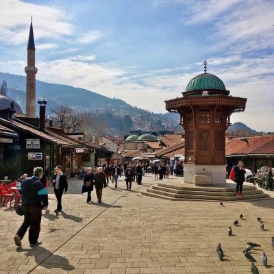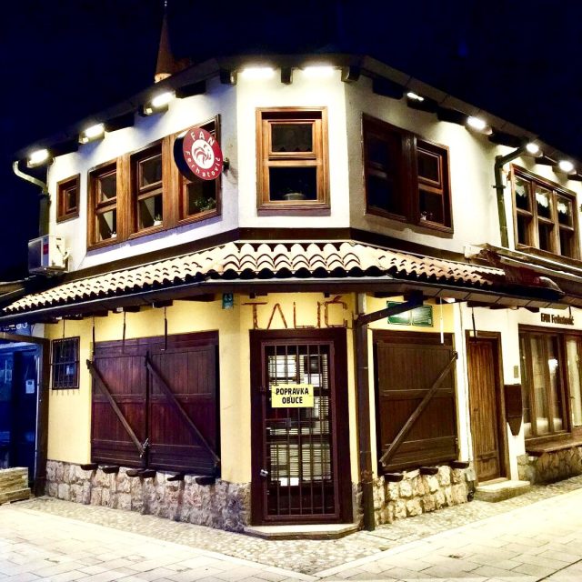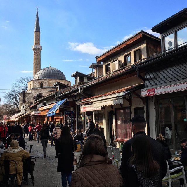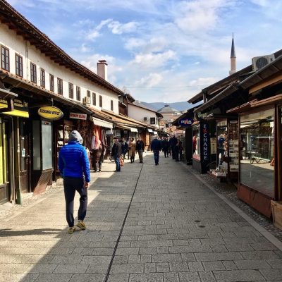 An diesem Sonntagnachmittag in Sarajevo kam es mir allerdings nicht vor, als spazierte ich durch die Hauptstadt eines Failed State. Die Stadt, die wirklich wunderschön ist, hat sich zumindest im Zentrum wieder mächtig herausgeputzt. Der langsam wieder wachsende Tourismus kann eine Chance für diese Stadt und vielleicht das ganze Land sein (rund eine Viertelmillion Touristen verzeichnet Sarajevo p. a., Tendenz steigend). Viele erkennbare Touristen begegneten uns zwar in der Nebensaison nicht, aber dennoch herrschte reges Treiben in der orientalisch anmutenden Altstadt. Die Cafés im Schatten der Moscheen waren so gut besucht, dass wir den ganzen Nachmittag vergeblich Ausschau nach einem freien Außenplatz hielten. Immerhin hatte es mittags mit einem Tisch beim besten Hackröllchengrillmeister der Altstadt geklappt. Sarajevo zu besuchen ohne Sarajevski cevapi zu verzehren, war für mich selbstredend unvorstellbar.