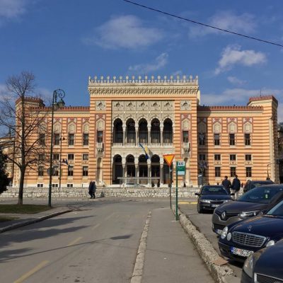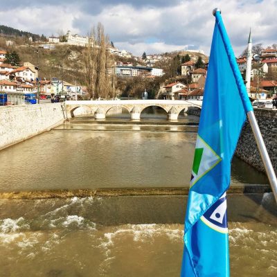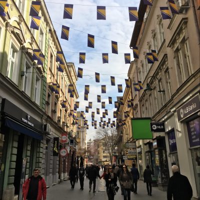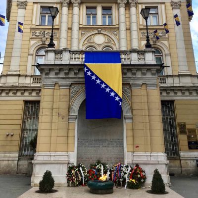 Bis 9 Uhr hatten wir uns Schlaf gegönnt, doch dann wurden die Vorhänge aufgerissen. Draußen kam die Sonne langsam durch, so dass die Motivation auf einen Touri-Tag in Sarajevo gleich nochmal stieg. Da erst vor zwei Tagen in der Entität Federacija Bosne i Hercegovine (nicht jedoch in der Republika Srspka) der Unabhängigkeitstag gefeiert wurde (am 1.März 1992 wurde per Referendum die Unabhängigkeit von Jugoslawien beschlossen), waren die umliegenden Straßenzüge noch reich mit Staatsfahnen geschmückt. Direkt vor unserer Unterkunft befand sich außerdem die Vječna vatra (ewige Flamme), die an die Opfer des Zweiten Weltkriegs erinnern soll, als Bosnien-Herzegowina vier Jahre lang von Nazi-Deutschland bzw. dessen faschistischem Verbündeten Kroatien okkupiert war. Es waren einige Kränze niedergelegt und ich gehe davon aus, dass die Bosniaken das Denkmal mittlerweile ebenso für das Gedenken an die Opfer des Bosnienkrieges nutzen.