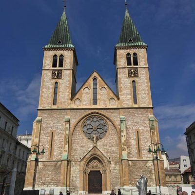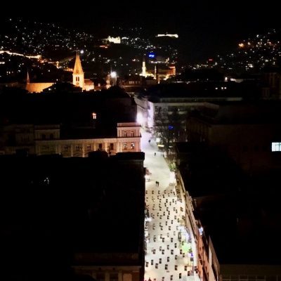 Nach dem Abendmahl, für das jeder rund 30 KM auf den Tisch legen musste, machten wir noch einen netten Nachtspaziergang durch Baščaršija und die banachbarte Neustadt aus der k.u.k.-Epoche (wo die Markthalle und die katholische, ebenso wie die christlich-orthodoxe Kathedrale zu finden sind). Sarajevos Innenstadt machte auch bei Dunkelheit eine gute Figur. Weil das Nachtleben dort allerdings nicht gerade pulsiert, kamen wir gar nicht erst in Versuchung die Schlafphase zu verkürzen und lagen gegen Mitternacht im Bett.