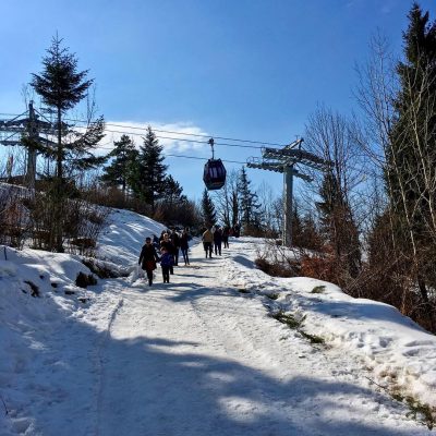 Der Wiederaufbau des Wahrzeichens hat natürlich einen hohen Symbolwert für die Bewohner Sarajevos und zugleich bringt er ihnen die Berge als Ausflugsziel wieder näher und hilft möglicherweise auch den Wintersporttourismus anzukurbeln. Schnee lag hier Anfang März passenderweise noch einiger. Wir spazierten ein wenig durch die Winterlandschaft und genossen den Ausblick über die Stadt und den Anblick der bosnischen Berge. Am späten Nachmittag traten wir die Rückfahrt an und orientierten uns langsam Richtung Stadion Grbavica, wo um 18 Uhr der FK Željezničar Sarajevo den FK Mladost Doboj Kakanj empfangen sollte. Fußball musste schließlich auch sein!