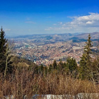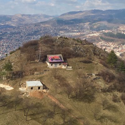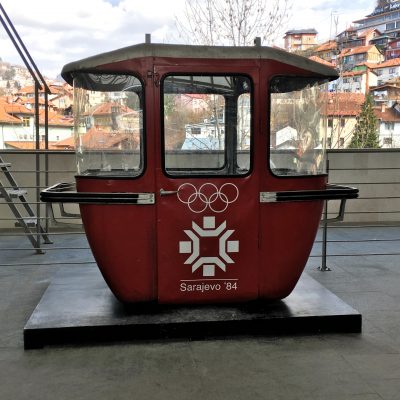 Nach unseren Erkundungen des Stadtzentrums, zog es uns anschließend in die Berge. Unweit von Lateinerbrücke und Altem Rathaus verbindet seit April 2018 wieder eine Seilbahn das Tal mit dem Vidikovac (auf 1.164 Höhenmetern ein Vorgipfel des 1.629 Meter hohen Trebević). Als Sarajevo 1984 die Olymischen Winterspiele ausrichten durfte, fanden an den Hängen des Trebević viele Wettkämpfe statt, u. a. ist hier noch die Bobbahn zu finden. Die ursprüngliche Seilbahn war von 1959, wurde aber leider im Bosnienkrieg zerstört. Der Seilbahn-Arbeiter Ramo Biber war hier übrigens am 2.März 1992 das erste offizielle Todesopfer der Schlacht um Sarajevo. Die Bergstation der neuen Seilbahn ist heute nach ihm benannt und eine Gedenktafel weist auf sein Schicksal hin.