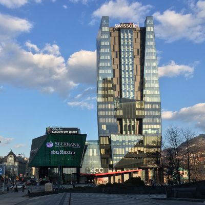 Von der Altstadt ging es nun die bereits erwähnte Sniper Alley entlang zum Stadtteil Grbavica. Wir passierten dabei das ehemalige Hotel Holiday Inn, die saudische Shopping Mall, das Parlamentsgebäude und die eindrucksvoll große US-Botschaft. Auf dem Weg fanden wir zahlreiche so genannte Sarajevske ruže (Rosen von Sarajevo). Die Bewohner der Stadt haben die ganzen Granatkrater aus der Belagerungszeit mit rotem Harz markiert, um an den Krieg und seine Opfer zu erinnern.