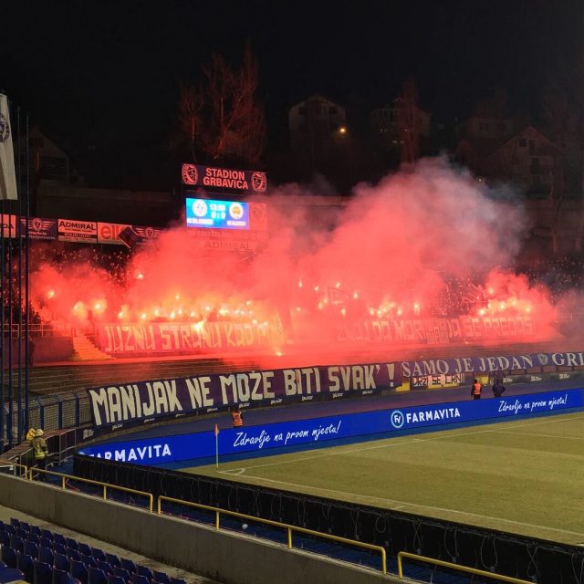 Aus sicherer Quelle wussten wir vorab, dass Željos Szene rund um die 1987 gegründete Gruppe Manijaci (The Maniacs / die Wahnsinnigen) für heute „was am Planen dran war“. Das bewahrheitete sich nun im Stadion, wo eine gute vierstellige Zahl von Supportwilligen die Kurve bevölkerte. Sie hatten rund 50 Schwenkfahnen im Gepäck und richtig Bock heute, so dass sich bereits vor Spielbeginn lautstark eingesungen wurde.